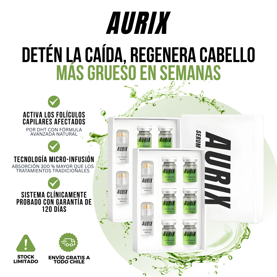 AURIX™ está diseñado para combatir la fragilidad y la rotura del cabello, promoviendo un cabello más grueso, voluminoso y saludable desde la raíz. Gracias a su fórmula científicamente elaborada, cada aplicación nutre profundamente los folículos, estimula el crecimiento natural y restaura la fuerza de las hebras existentes.
