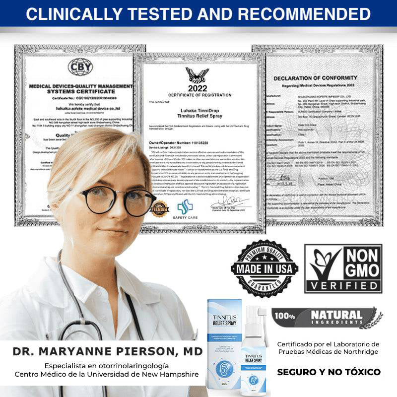 La Dra.  Camila Pérez, otorrinolaringóloga del Centro Médico de la Universidad de New Hampshire en Massachusetts, y muchos otros otorrinolaringólogos han considerado Hearmax™ Tinnitus Relief Spray como una solución innovadora para las personas cuyo tinnitus persiste como un obstáculo crónico. Mientras que algunas personas pueden experimentar una reducción o alivio de los síntomas con el tiempo, otras descubren que el tinnitus sigue teniendo un impacto significativo en su vida diaria. Hearmax™ se considera un remedio de venta libre muy eficaz, que proporciona alivio del tinnitus y sus síntomas asociados.