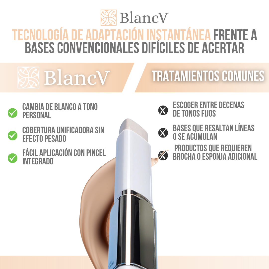 La fórmula de BlancV™ contiene microcápsulas inteligentes que reaccionan al contacto con la piel, ajustando su pigmento de manera automática para igualarse a tu tono natural y dejar un acabado fresco y uniforme.