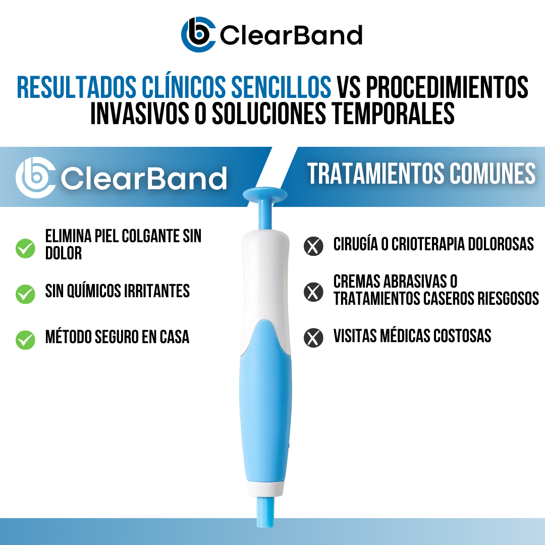 ClearBand™ está diseñado para ser completamente seguro e indoloro, utilizando un método de ligadura con pequeñas bandas de goma que reduce el suministro de sangre a la piel, permitiendo que las marcas desaparezcan de forma natural. No tendrás que preocuparte por quemaduras, alergias, picazón o dolor, ya que este principio físico trabaja suavemente sobre la piel, ofreciendo resultados visibles sin necesidad de costosos tratamientos dermatológicos o visitas médicas. Es ideal para quienes buscan una solución eficaz y segura en la comodidad de su hogar.