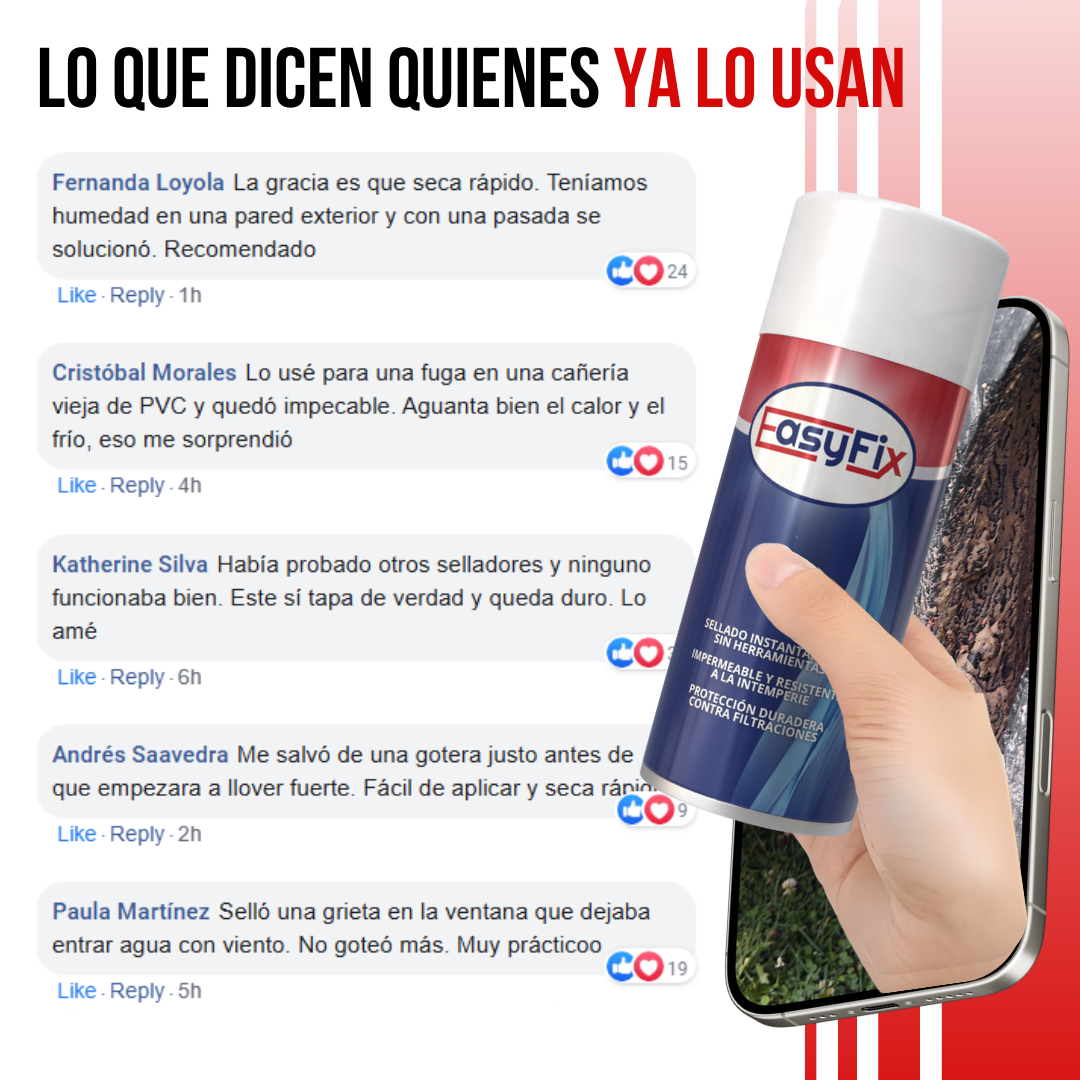 Los usuarios valoran que EasyFix™ funciona incluso para quienes nunca han hecho reparaciones, ya que es simple, rápido y efectivo. Muchos mencionan que les ha permitido resolver filtraciones difíciles sin gastar en servicios técnicos. Destacan también su capacidad de sellar sobre materiales típicos del hogar chileno: zinc, concreto, PVC, ventanas y paredes exteriores. El ahorro, la durabilidad y la facilidad de uso hacen que los clientes lo recomienden constantemente.