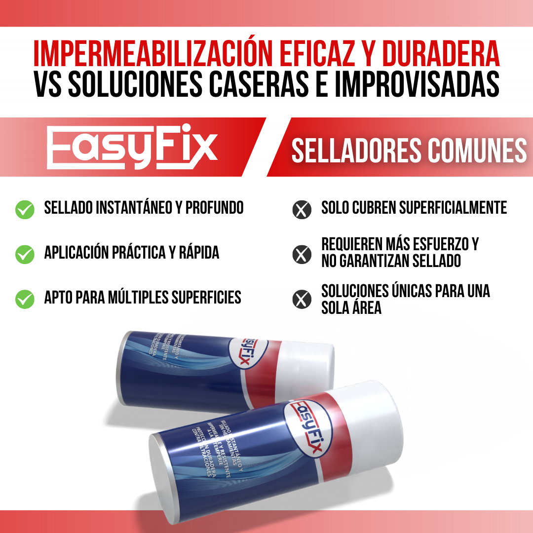 EasyFix™ destaca por ofrecer impermeabilización inmediata, aplicación sencilla y un acabado más uniforme que muchos selladores convencionales. No requiere herramientas, mezclas ni procesos engorrosos: solo agitar, rociar y dar un brochazo. Su fórmula avanzada cubre fisuras más pequeñas que otros productos, evitando filtraciones futuras y proporcionando un sellado más seguro. Es la combinación perfecta entre rapidez, durabilidad y facilidad de uso.