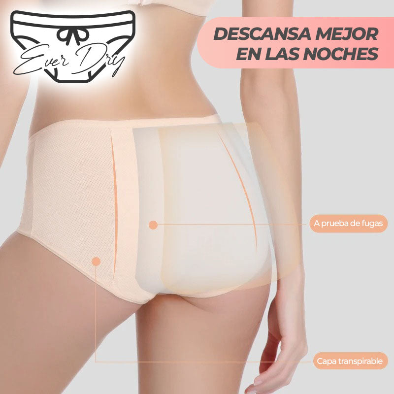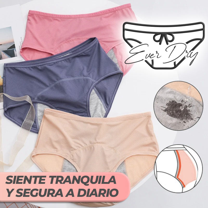 Ever Dry está diseñado para resolver el problema de las fugas incómodas durante el ciclo menstrual. Con una capa central de alta absorción, puede retener hasta 50ml de líquido, lo que equivale a 2-3 tampones o compresas. Olvídate de accidentes o manchas inesperadas y mantente cómoda y segura durante todo el día.