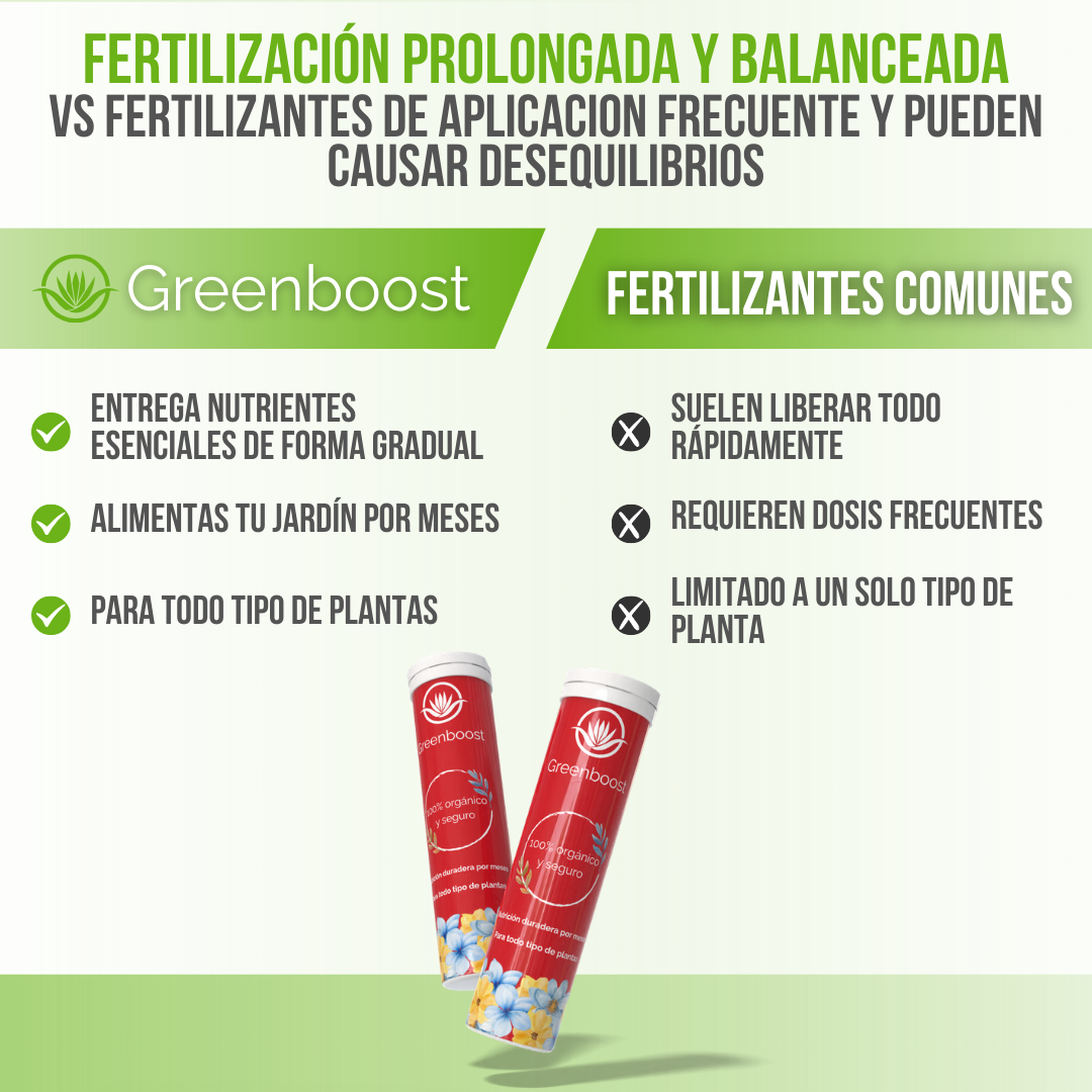 A diferencia de los fertilizantes químicos que actúan rápido pero se lavan con facilidad, Greenboost™ mantiene una liberación dosificada y constante, evitando desperdicios y protegiendo la calidad del suelo. Es más seguro, más efectivo y más amable con plantas delicadas. Tampoco genera acumulación de sales ni requiere aplicaciones semanales, lo que ahorra tiempo y dinero. Greenboost™ es un producto premium pensado para jardineros exigentes que buscan resultados reales sin complicaciones.