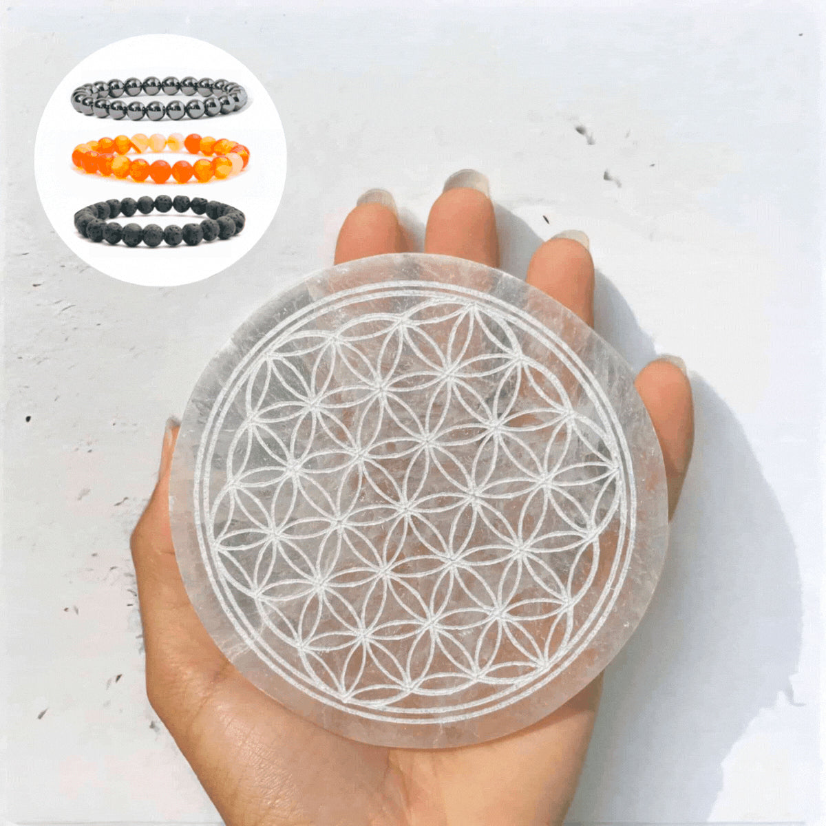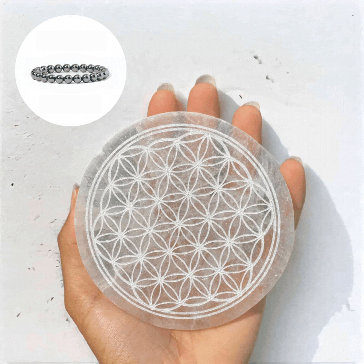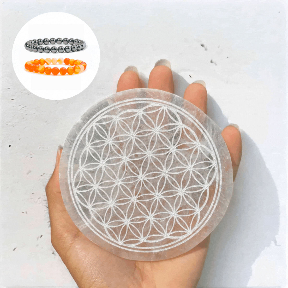 Equilibra las energías con la Selenita y la Flor de la Vida. Esta combinación única purifica tus piedras y joyas naturales de manera profunda y sin complicaciones. La Selenita de Flor de la Vida actúa como un amplificador de energía, limpiando y revitalizando tus objetos sin importar su sensibilidad.