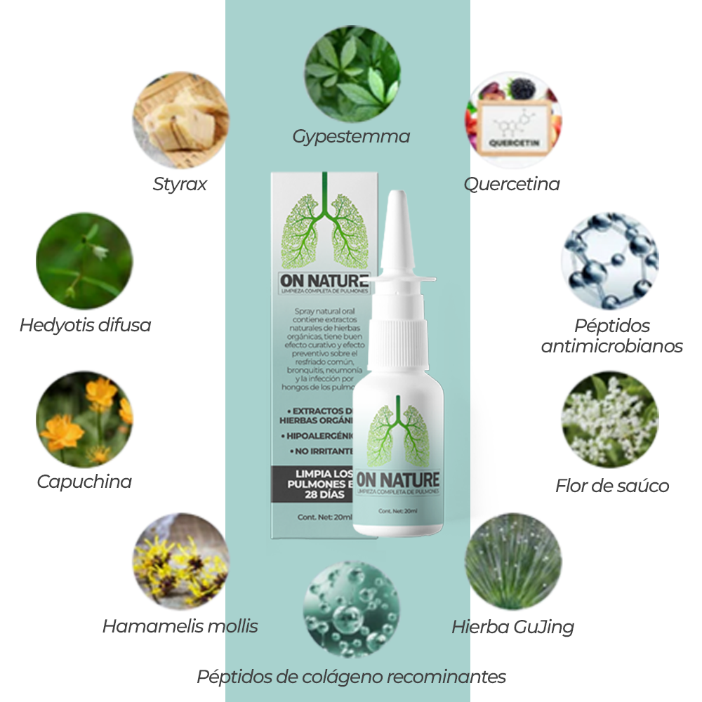El uso regular de On Nature no solo limpia tus pulmones sino que también previene problemas respiratorios a largo plazo. Su fórmula natural y libre de químicos es segura para el uso diario, proporcionando una opción confiable y efectiva para mantener tus pulmones limpios y funcionando de manera óptima. Alivia las molestias causadas por el aire contaminado y mejora tu calidad de vida.