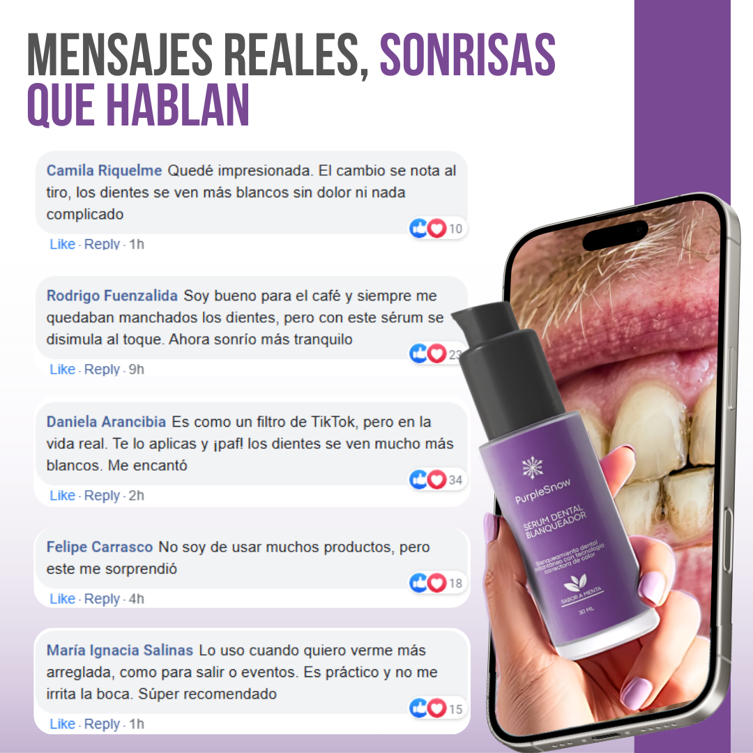 ¡Transforma tu sonrisa al instante con PurpleGlow™! Este revolucionario producto se ha convertido en un fenómeno viral en TikTok, gracias a su increíble capacidad para ocultar las manchas amarillas de los dientes al instante.
