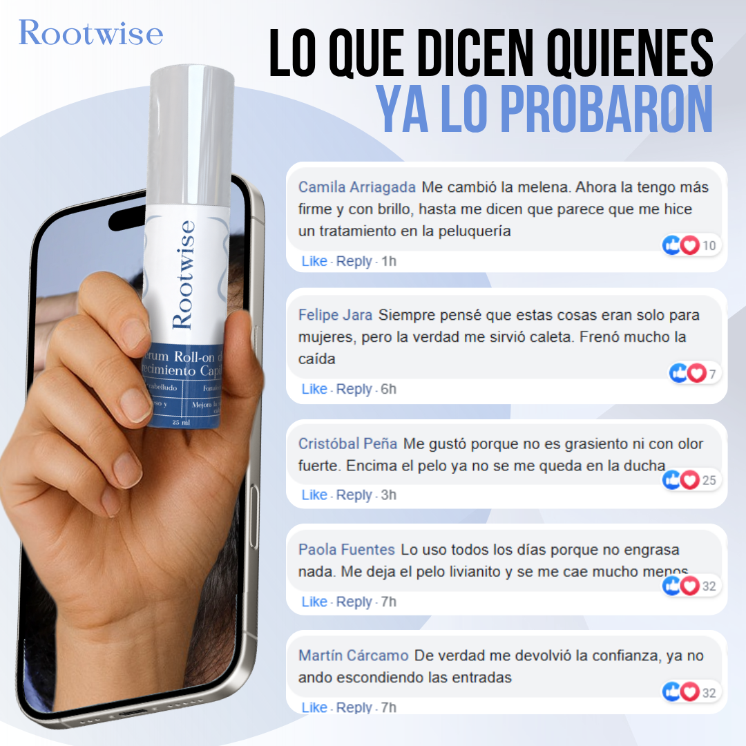 Usuarios que ya incorporaron Rootwise™ en su rutina comentan que notan menos caída desde las primeras semanas, más volumen y una sensación de cabello más vivo y con fuerza.