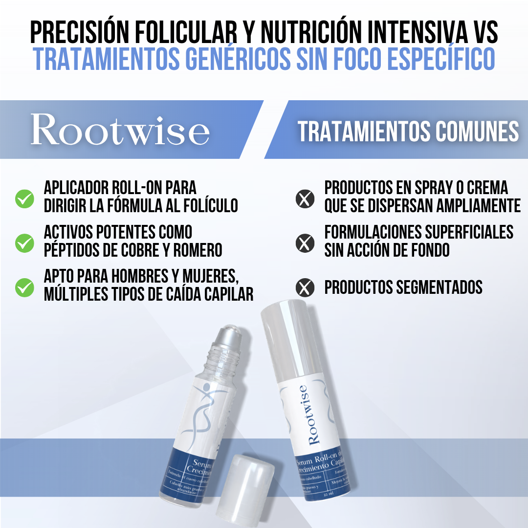 Rootwise™ está formulado con ingredientes botánicos naturales, por lo que es seguro y no produce efectos adversos conocidos. En casos de piel sensible, se recomienda probar una pequeña cantidad antes del uso completo.
