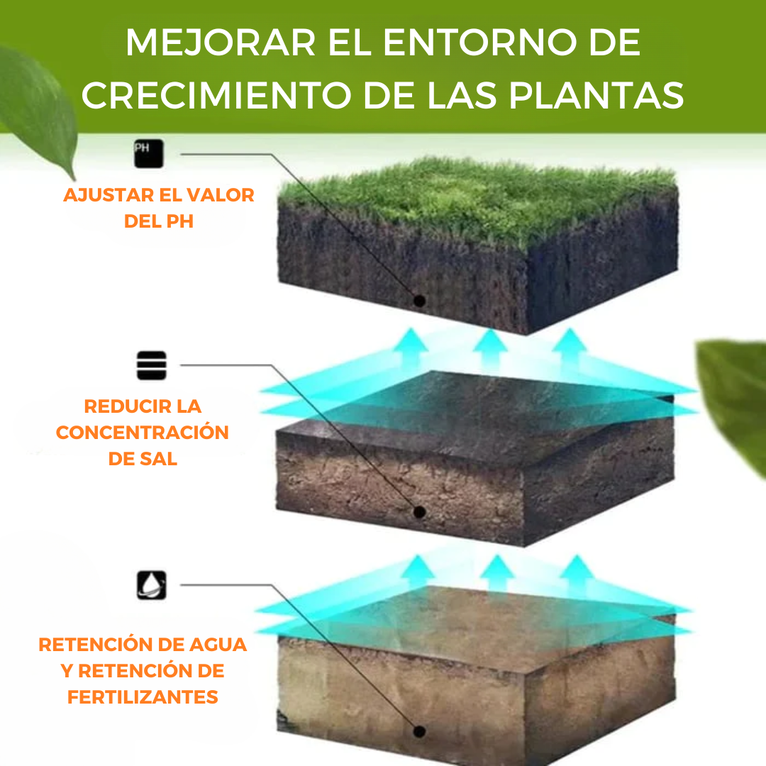 Este producto ajusta el pH del suelo y reduce la concentración de sal, al tiempo que potencia la capacidad de retener agua en combinación con fertilizantes. Estas cualidades garantizan un ambiente ideal para un crecimiento saludable, promoviendo un desarrollo vigoroso y una nutrición óptima de las plantas.