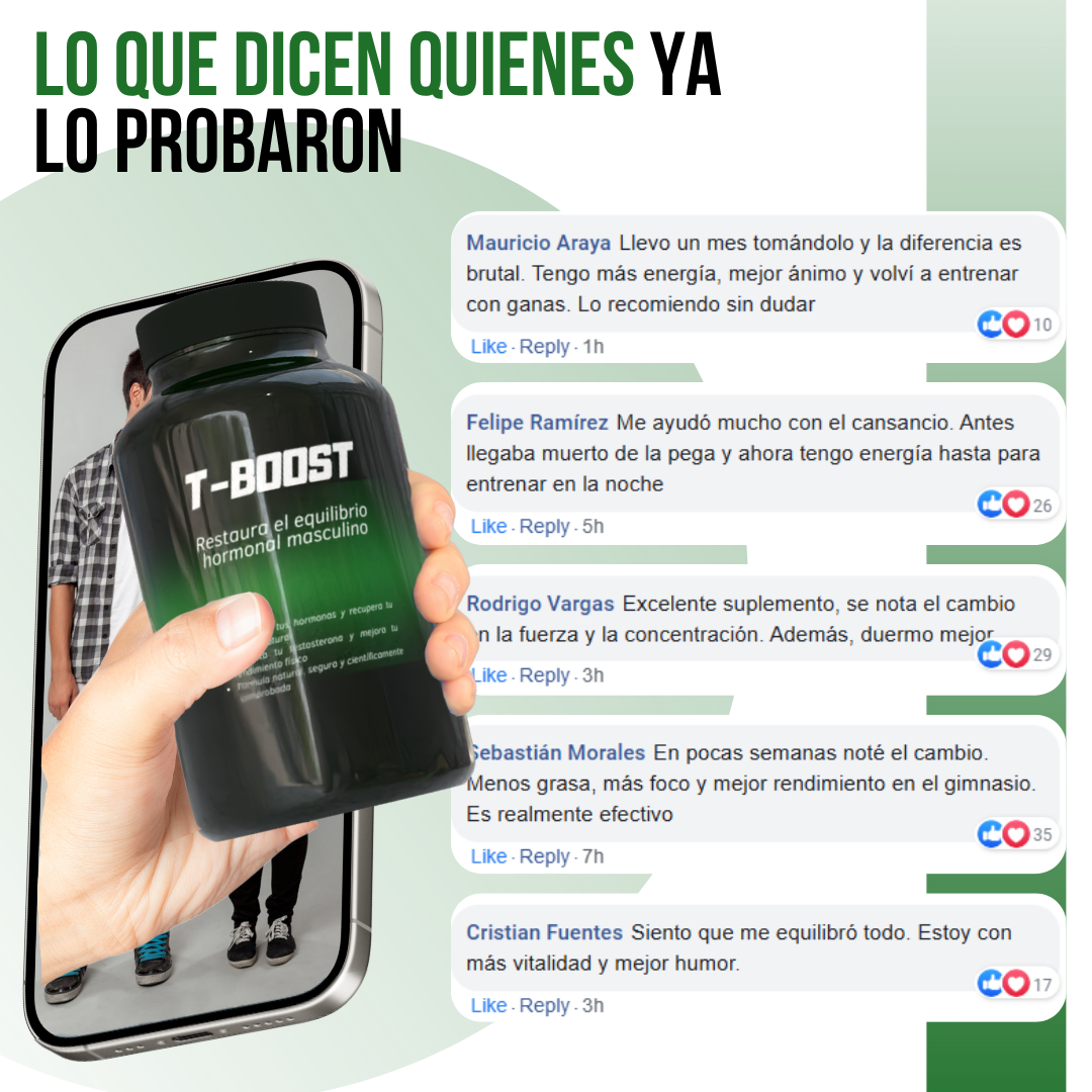 T-BOOST™ está pensado para hombres que presentan síntomas de desequilibrio hormonal, como baja energía, dificultad para ganar masa muscular, grasa abdominal o disminución de la libido. Es ideal para quienes buscan una solución natural para reactivar su vitalidad.