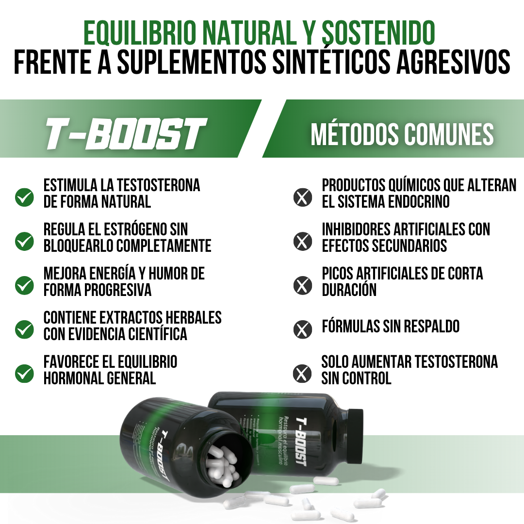Sí, la fórmula de T-BOOST™ está compuesta por ingredientes clínicamente probados y naturales, sin esteroides ni hormonas artificiales. Está elaborada bajo estándares de calidad y seguridad, lo que garantiza un consumo confiable y sostenido.