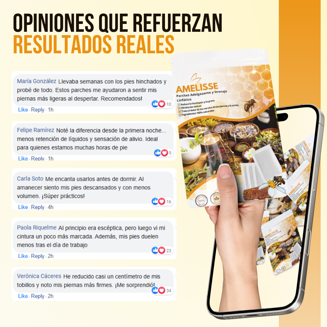 Los parches Amelisse™ estimulan el drenaje linfático natural del cuerpo, ayudando a reducir la hinchazón y favoreciendo la desintoxicación. El veneno de abeja y los ingredientes naturales trabajan para eliminar toxinas y mejorar el bienestar general.