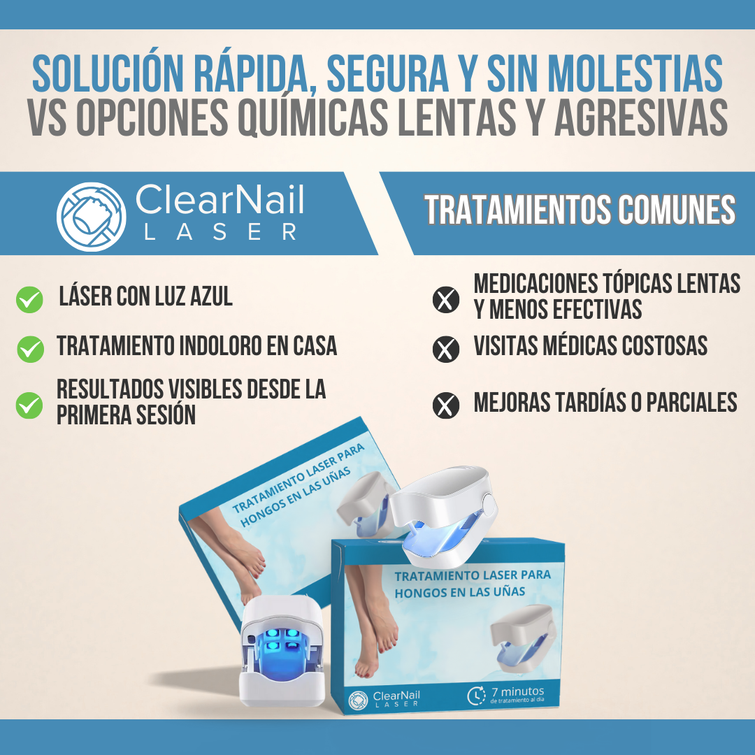 A diferencia de los tratamientos genéricos que a menudo son costosos, invasivos o difíciles de usar, ClearNail Laser™ ofrece resultados rápidos con su doble tecnología laser y luz azul antibacteriana de alta frecuencia, que permite un tratamiento seguro y cómodo en la privacidad de tu hogar.