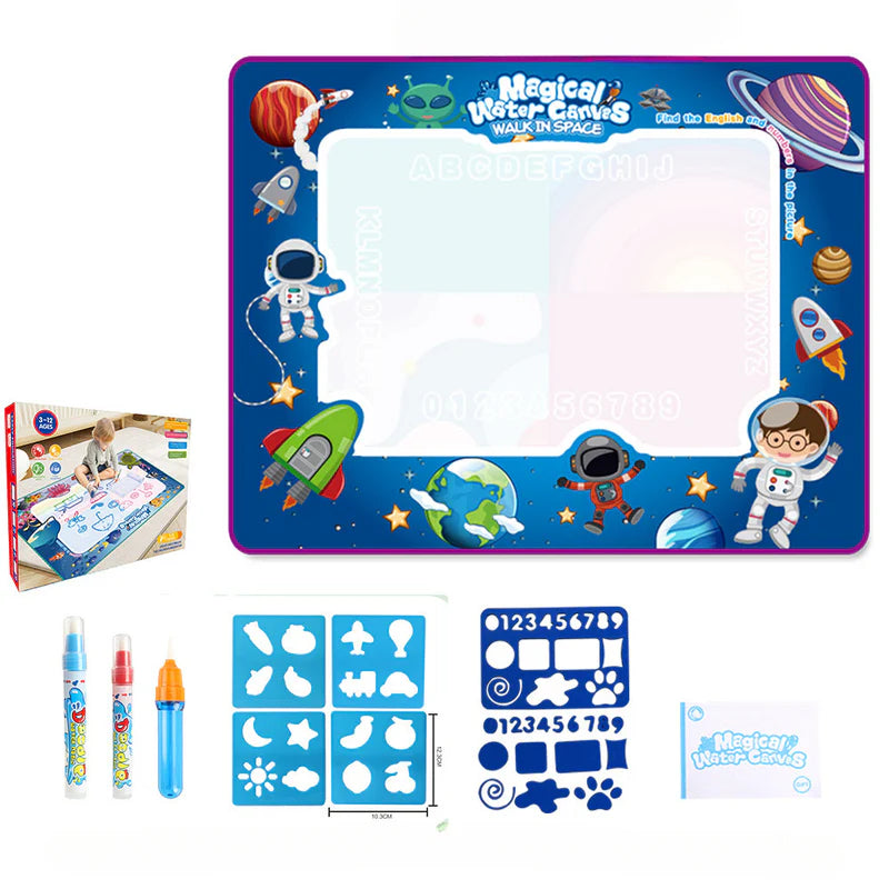 Con esta alfombra mágica, los niños pueden pasar horas dibujando, escribiendo y borrando, sin ensuciar nada en casa. El agua se convierte en su única herramienta, por lo que no hay manchas que limpiar ni ropa que lavar. Solo se necesita un poco de agua en los rotuladores incluidos y la magia comienza. Al secarse, el dibujo desaparece y pueden empezar de nuevo una y otra vez.