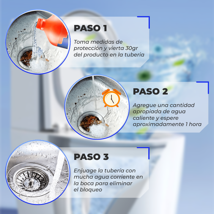 Este limpiador de drenaje de tuberías cuenta con una fórmula suave que no daña el esmalte del inodoro ni las tuberías. Úsalo con confianza y mantén tu hogar en óptimas condiciones, sin riesgos de daños a largo plazo.