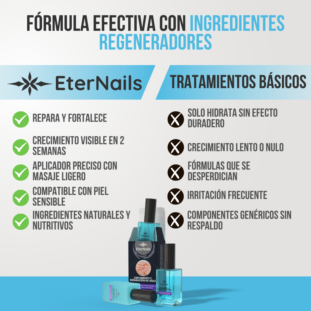 A diferencia de los tratamientos genéricos que a menudo son costosos, invasivos o difíciles de usar, ETERNAIL™ ofrece un enfoque integral para el cuidado de las uñas, combinando reparación, nutrición y crecimiento acelerado.