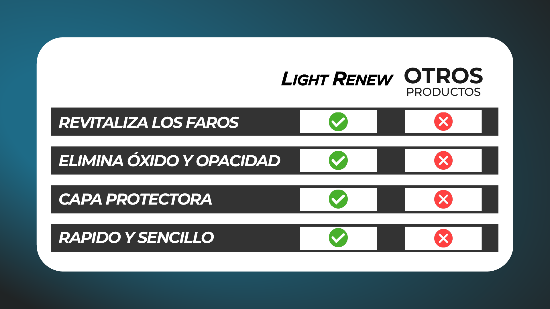 LightRenew ™ es la solución definitiva para renovar la claridad de tus focos. Olvídate de la apariencia desgastada y sin brillo, y dale a tus faros un nuevo resplandor que revitaliza no solo su estética, sino también su rendimiento.