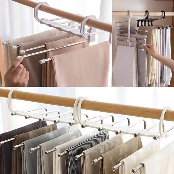 Nuestro percha multifuncional puede contener hasta 5 pares de pantalones, ofreciendo una eficiencia de espacio igual a la de un solo par. Ya sea que utilice dos ganchos u opte por colgarlo verticalmente, este colgador mejora enormemente la organización de su closet.