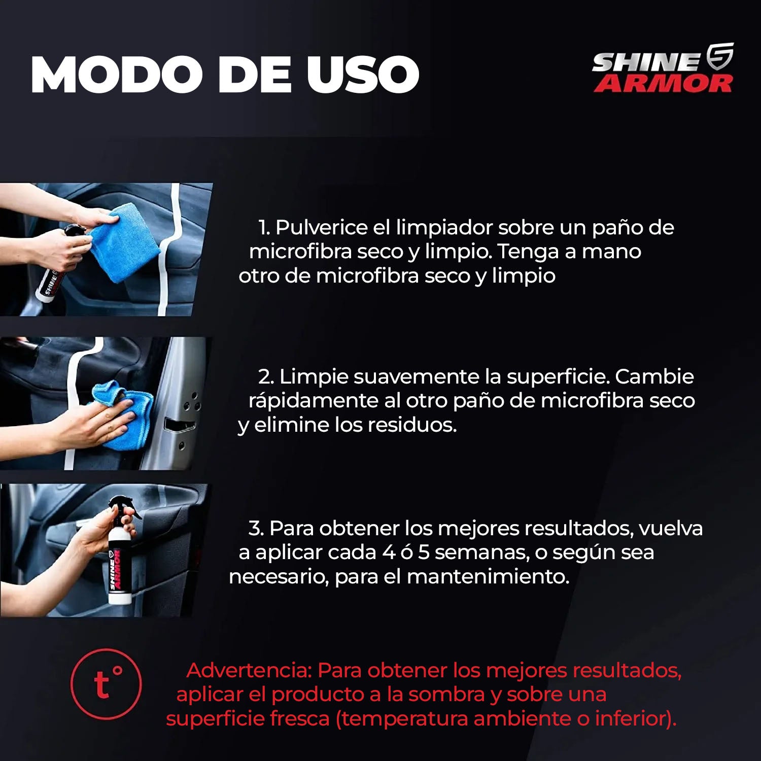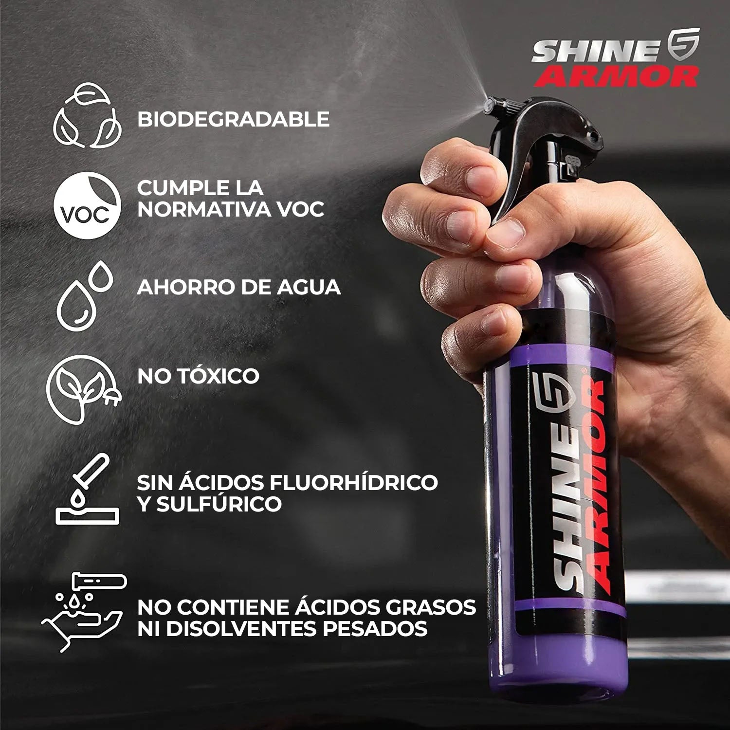 Shine Armor no solo revitaliza el aspecto de los plásticos y cauchos, sino que también los protege contra futuros daños. Ideal para automóviles, motocicletas, bicicletas y más, restaura el brillo y la vitalidad de las superficies descoloridas y opacas, mientras que ofrece una protección duradera que mantiene tu vehículo en perfecto estado.
